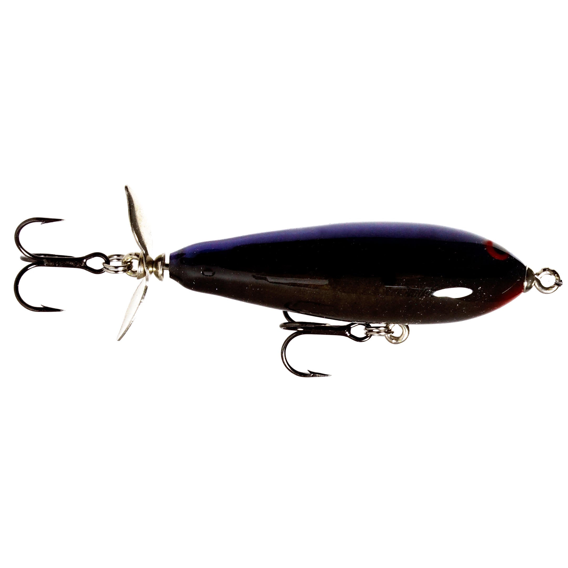 The Crippled P has that unmistakable churning action of a classic single rear prop bait. Match the forage with our beautiful hand painted patterns, this bait is an ideal imitation of a wounded baitfish sputtering across the surface. Bait sits tail down when not in motion causing that erratic action and side to side jumping motion when twitched. Bait has extremely good hook up ratio due to this design.